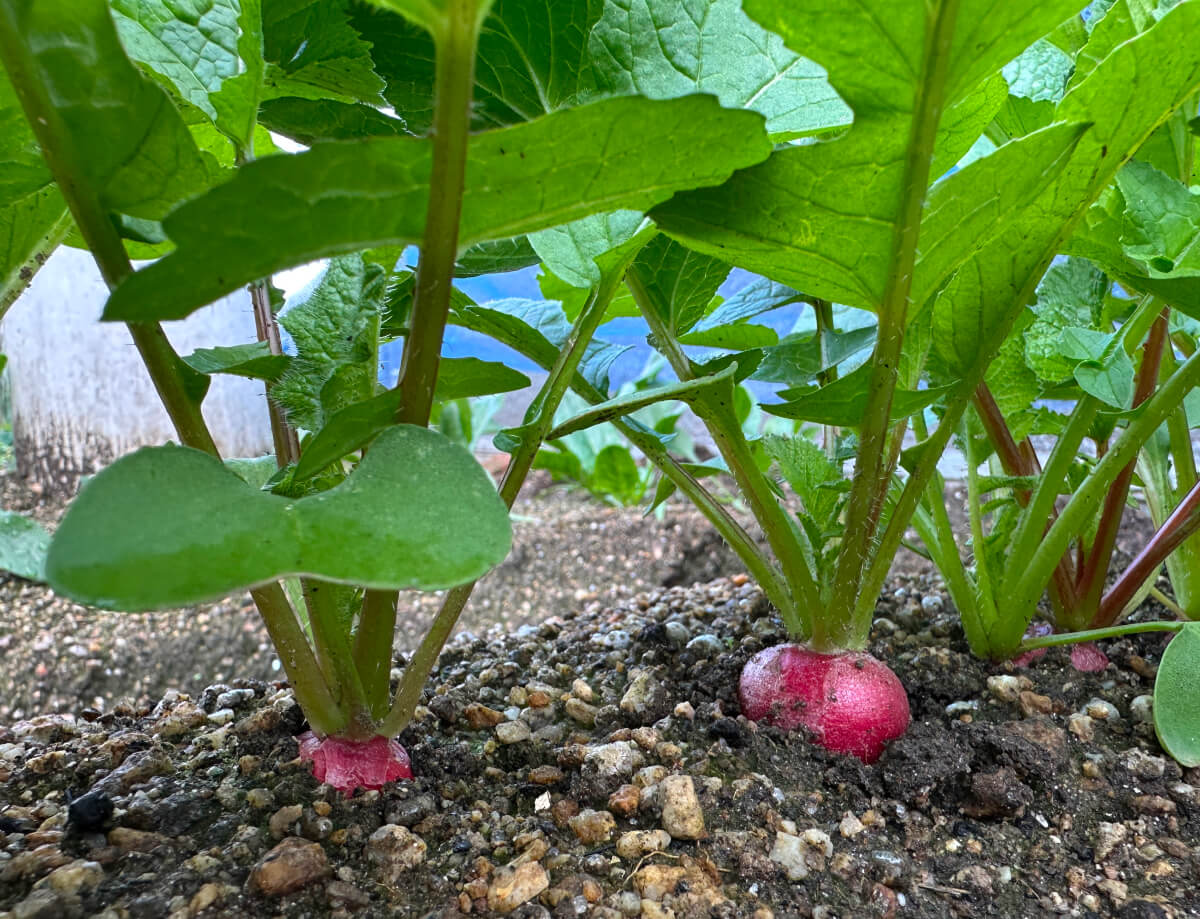 左からベビーキャロット、ほうれん草。右はハツカダイコンを収穫した畝です。